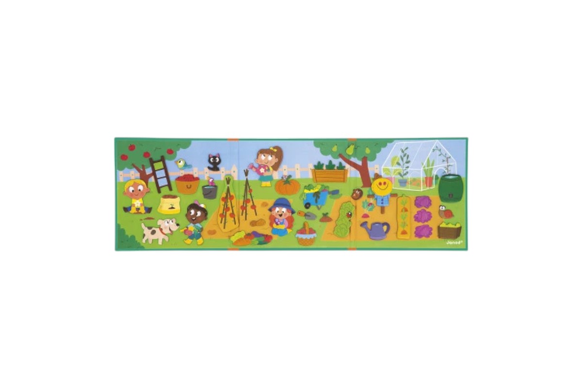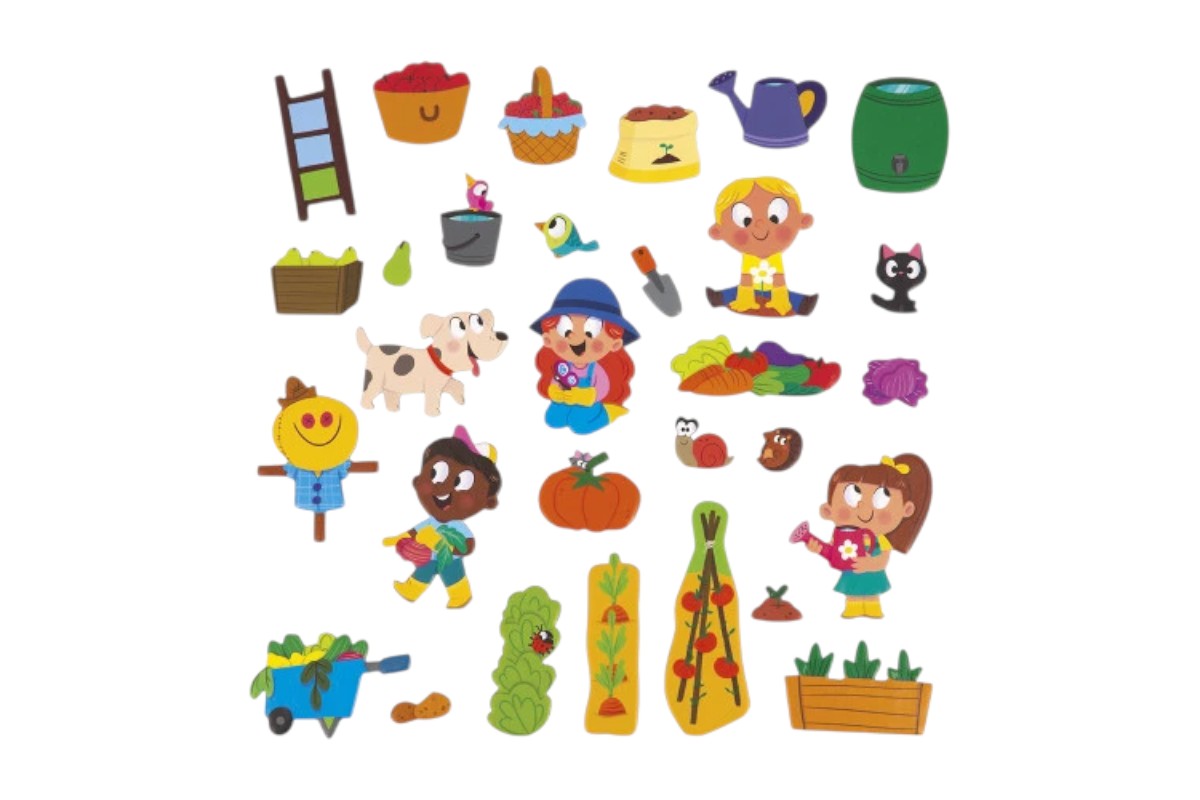Magnetna igra Magnéti’stories vrt vsebuje ilustrirano magnetno ozadje in 30 magnetnih kosov z motivi zelenjave, sadja in vrtnarskih prijateljev.